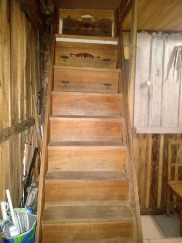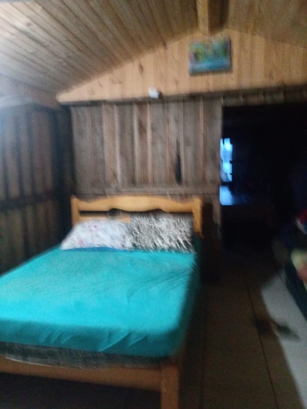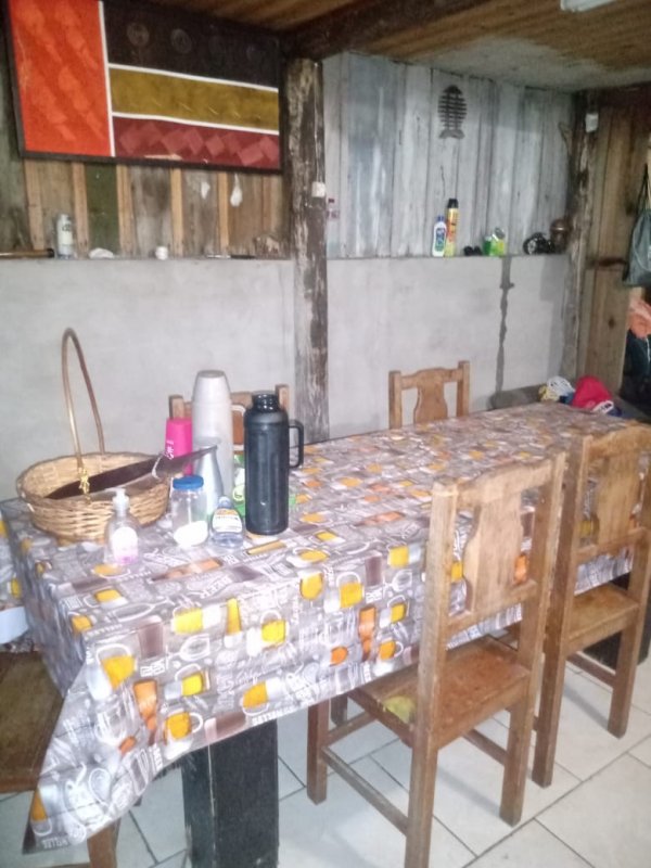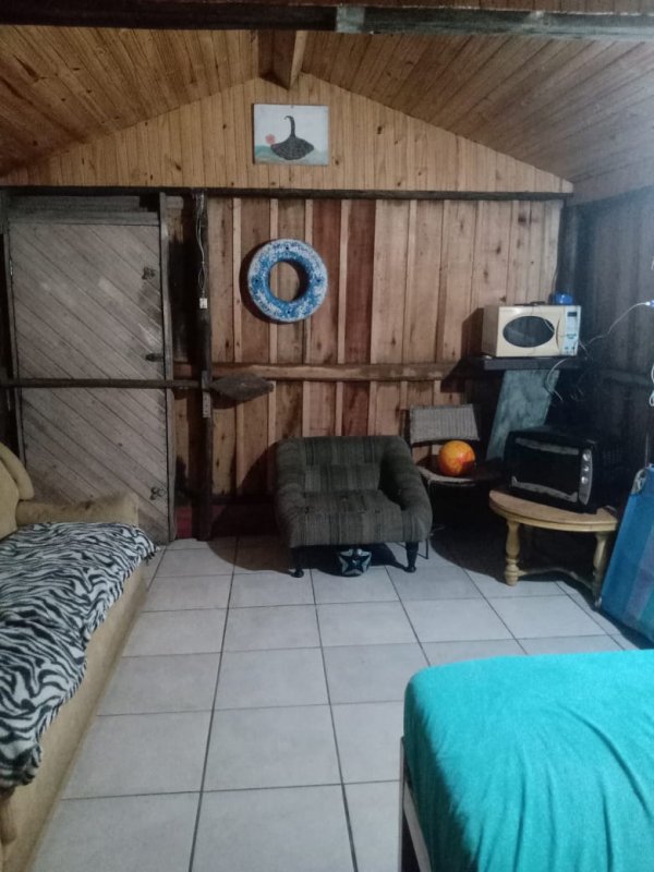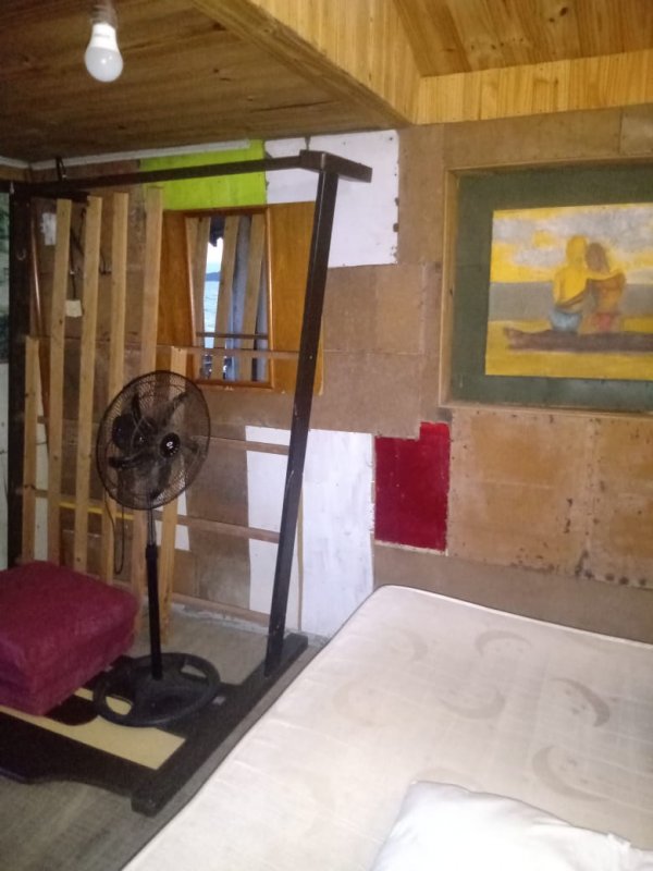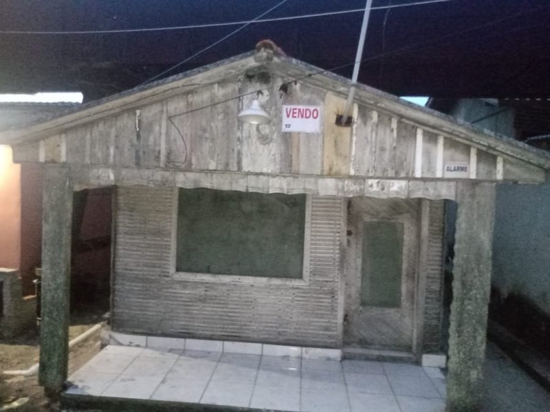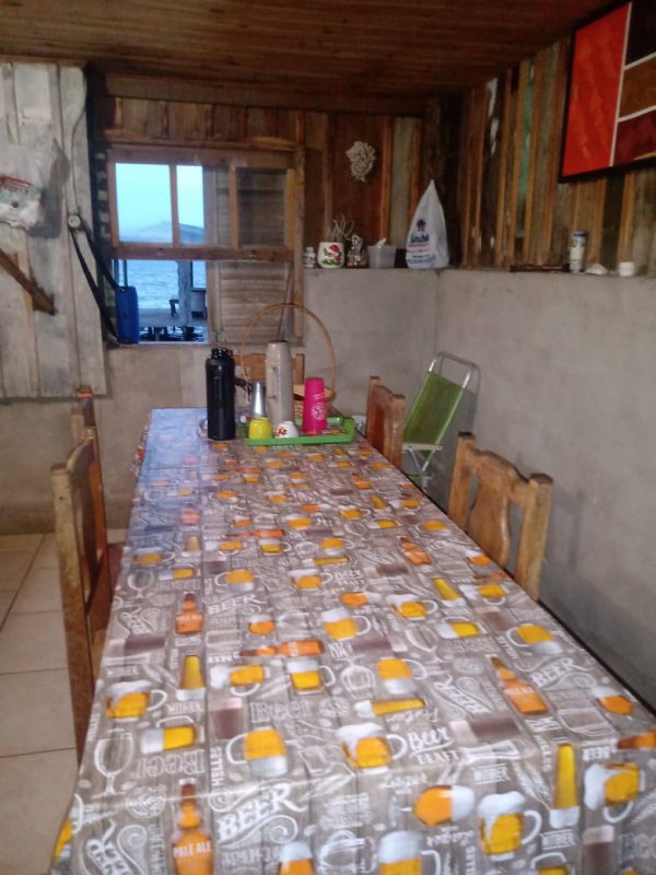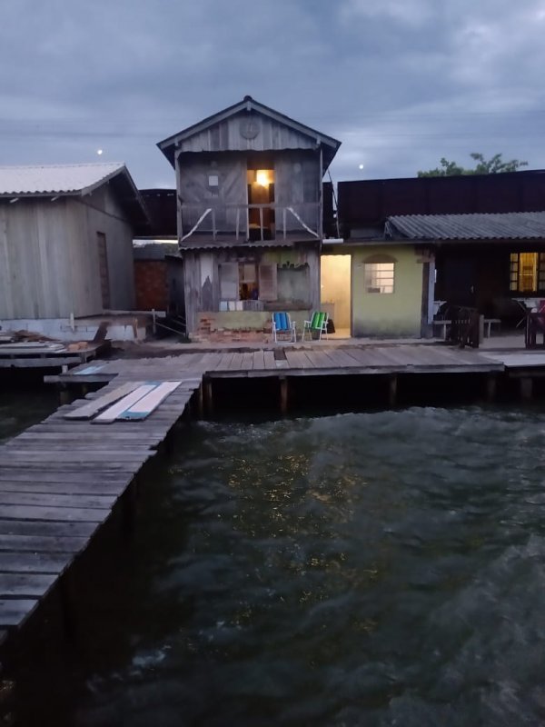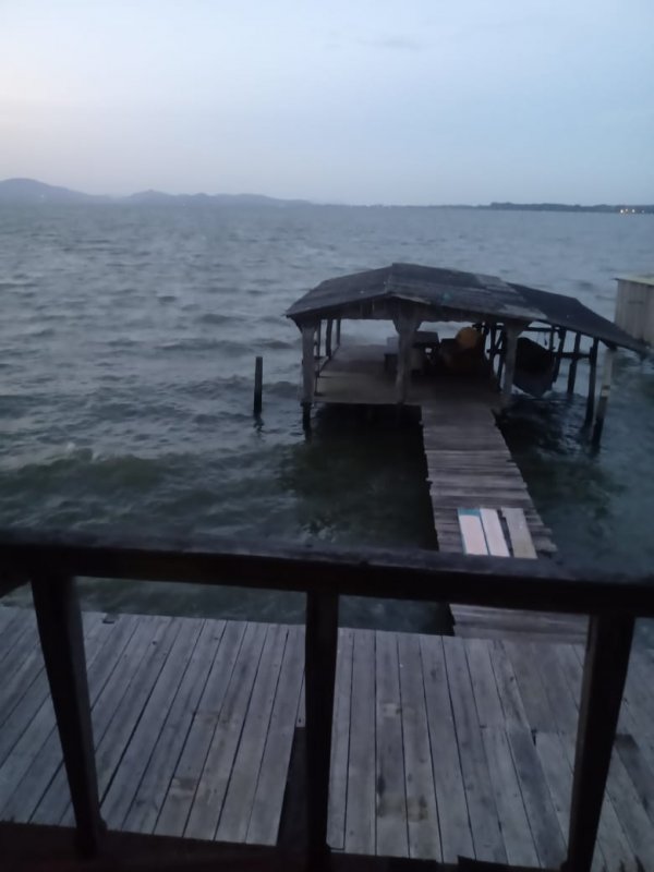 Casa de madeira na beira da Lagoa, na Cabeçuda (Laguna-SC), com trapiche. Possui 2 andares, 2 quartos, sala, cozinha, banheiro.